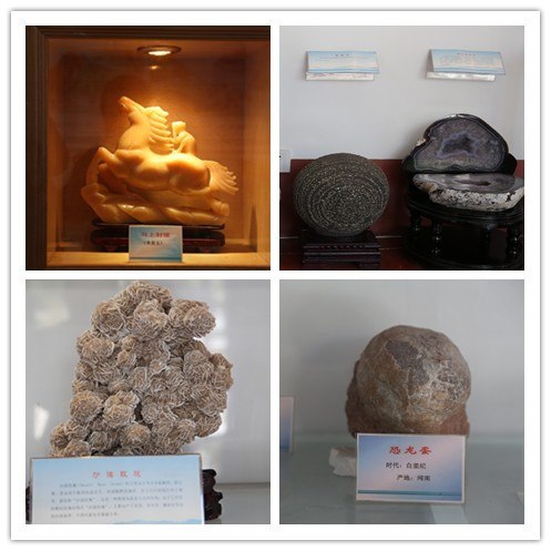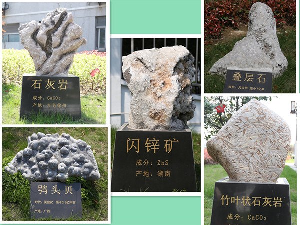基地内还有南京地质博物馆所赠送的五块化石:竹叶状石灰岩、闪锌矿、叠层石、石灰岩、鸮头贝。