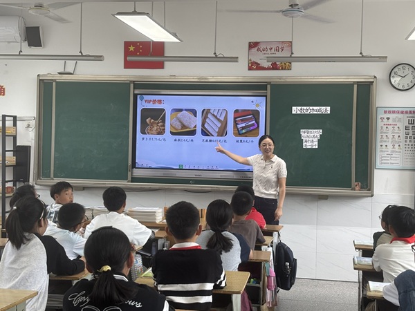 课堂上,刘云老师立足学生生活经验,以苏超为情境导入,快速激发学生兴趣。教学中,她紧扣“小数点对齐”这一核心重难点,通过多种直观方式,帮助学生理解“相同数位对齐”的算理;同时设计分层练习,从基础计算到实际问题解决,逐步提升学生运算熟练度,课堂互动氛围浓厚,学生参与度高。