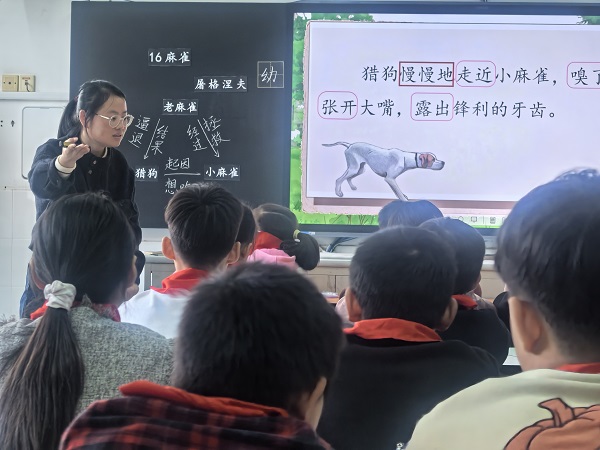 朱老师以“麻雀印象”导入新课,引导学生结合生活经验感知麻雀形象,自然切入文本。教学中,紧扣“故事要素与人物形象”展开,通过初读梳理时间、地点、人物及故事起因、经过、结果,帮助学生搭建叙事框架;再通过品读小麻雀“呆呆的、无可奈何”的神态动作、猎狗“张开大嘴、露出锋利牙齿”的动作描写等细节,引导学生深入理解角色形象,体会文本情感内涵。同时,注重阅读方法与写作技巧的渗透,如分析环境描写的铺垫作用、动作神态描写对塑造形象的价值,鼓励学生在写作中借鉴文本写法,实现读写结合。