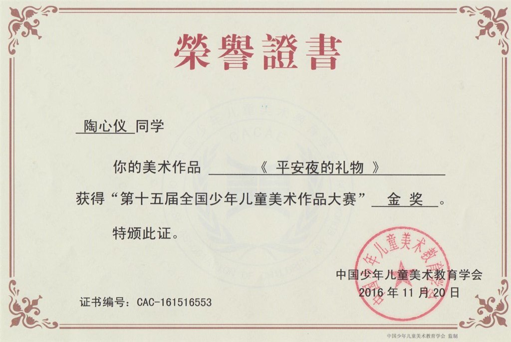 在“第十五届全国少年儿童美术作品大赛”中有金奖3人,银奖1人,铜奖1 人,贺珊珊老师获得“少年儿童美术教育成果”二等奖。
